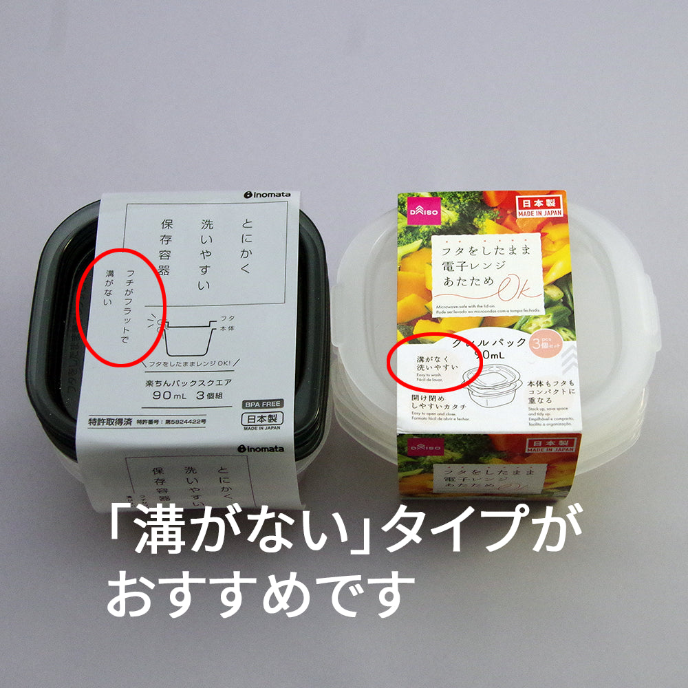 食品用プラスチック容器の中でも、フタと本体に溝がないタイプがおすすめです。